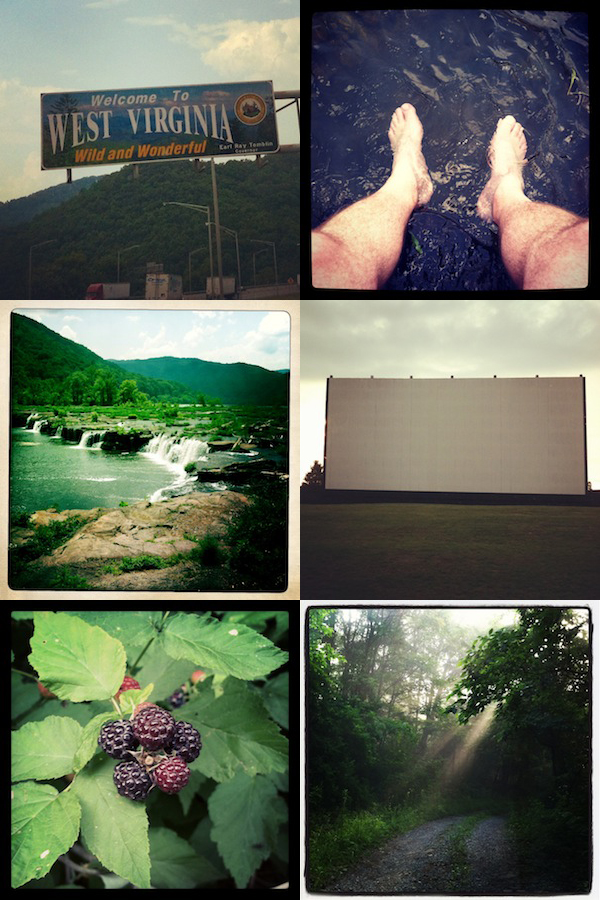 9. iPhone montage (from top to bottom, left to right): 1) Welcome to West Virginia, I77 North coming out of the East River Mountain Tunnel, 2) Dipping my feet in the New River, 3) Sandstone Falls at the New River, 4) Pipestem Drive Inn, 5) Picking black rasberries in Elgood, and 6) Morning light in Elgood.